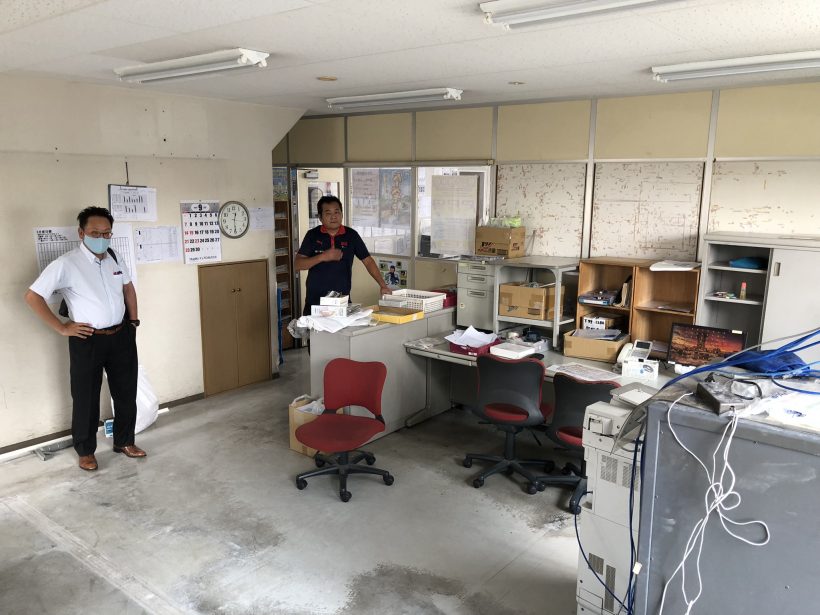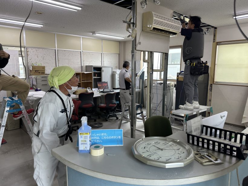 9月9日、ASA宇都宮南部店の1階。受付と営業エリアの間にあった間仕切り壁を抜く工事を実施しました。朝一で職人さんが10人ほど来店し、あっという間に壁を撤去している様子です。(写真はAM9:00頃)