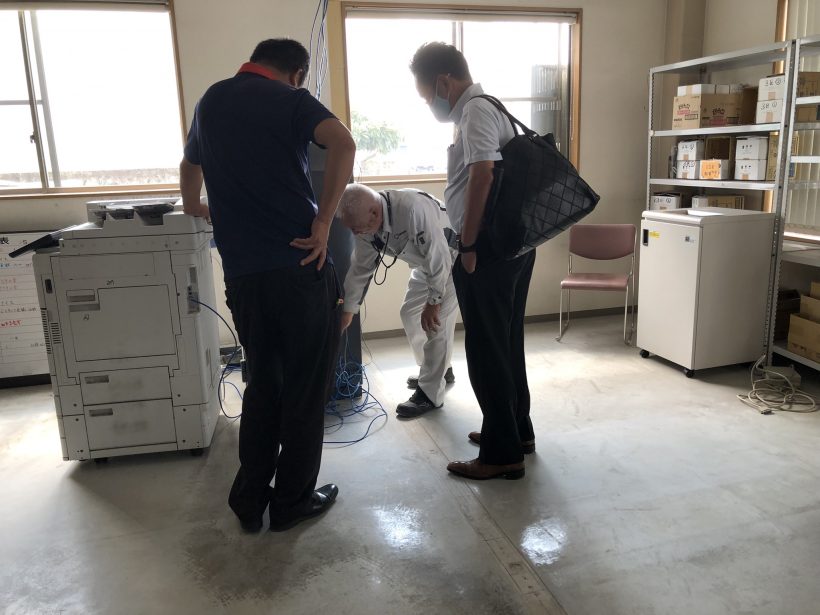 工事後、工務店の方から説明を受ける社長(写真右)と、統括マネージャー。
