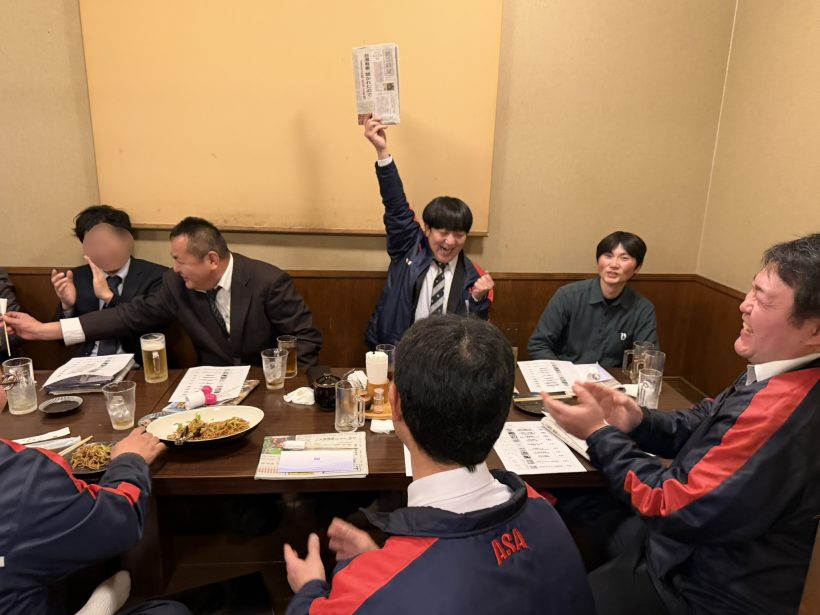 方針発表会後は会社近くのお店で打ち上げを兼ねた忘年会を開催しました。数週間、方針発表会の準備に追われた社員たちは、この時間はみなホッとした表情を見せます。食事を楽しみ、ES向上委員会が取り仕切る恒例のゲーム大会で盛り上がりました。