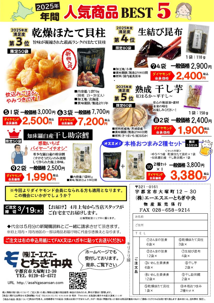 北海道の物品販売企画でお世話になっている、(株)感動いちば様から「2025年 年間人気商品(常温)BEST5」販売のお知らせです。当社でも毎年ご好評いただいている「乾燥ほたて貝柱」もランクインしております。