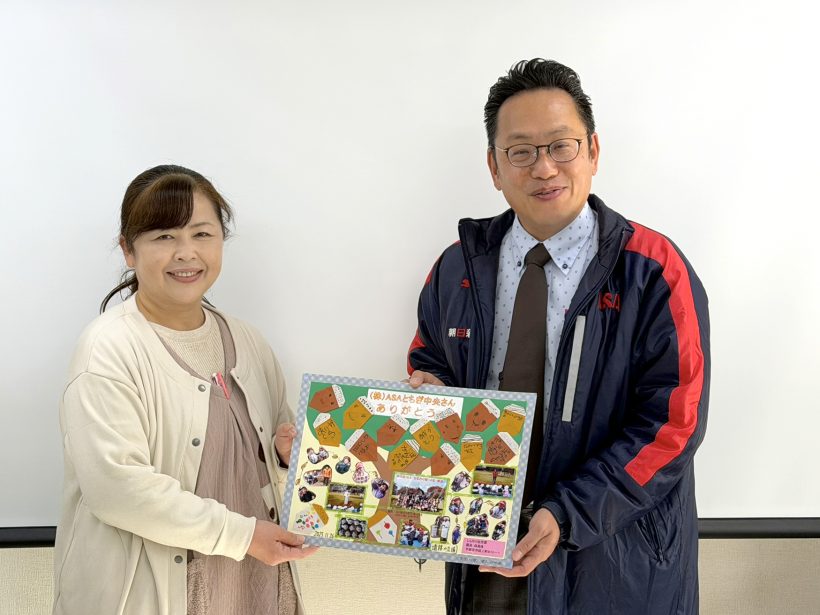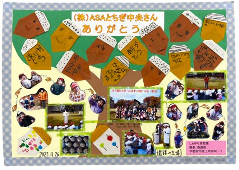 昨年11月に開催した「園児たちとのどんぐり拾い」に協力していただいた「しらゆり幼児園(砥上町)」様から、そのときの思い出にと、写真や切り絵、折り紙などを使った手作りのイラストボードをいただきました。